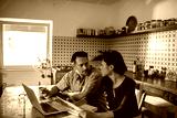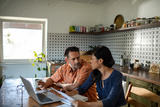 Couple managing bills with smartphone and laptop on kitchen desk at home