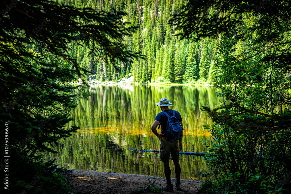 Beaver lake landscape hiking trail in Beaver Creek ski resort by Avon, Colorado water surface in summer in Holy Cross Wilderness, man standing looking