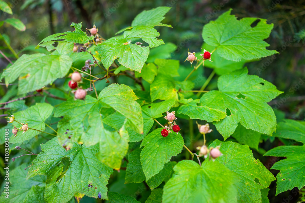 Hanging red ripe wineberries wine berries closeup in Colorado ripening on plant bush garden farm with green leaves