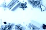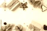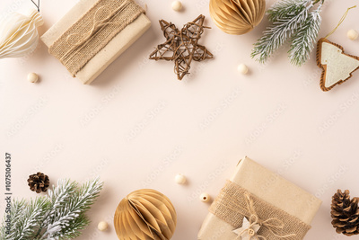 A festive flat lay featuring rustic Christmas gifts wrapped in natural paper, surrounded by pine cones, ornaments, and greenery on a neutral background