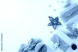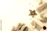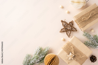 A top view of rustic Christmas gifts wrapped in burlap with pine branches, wooden star, and festive decorations, capturing a natural holiday theme