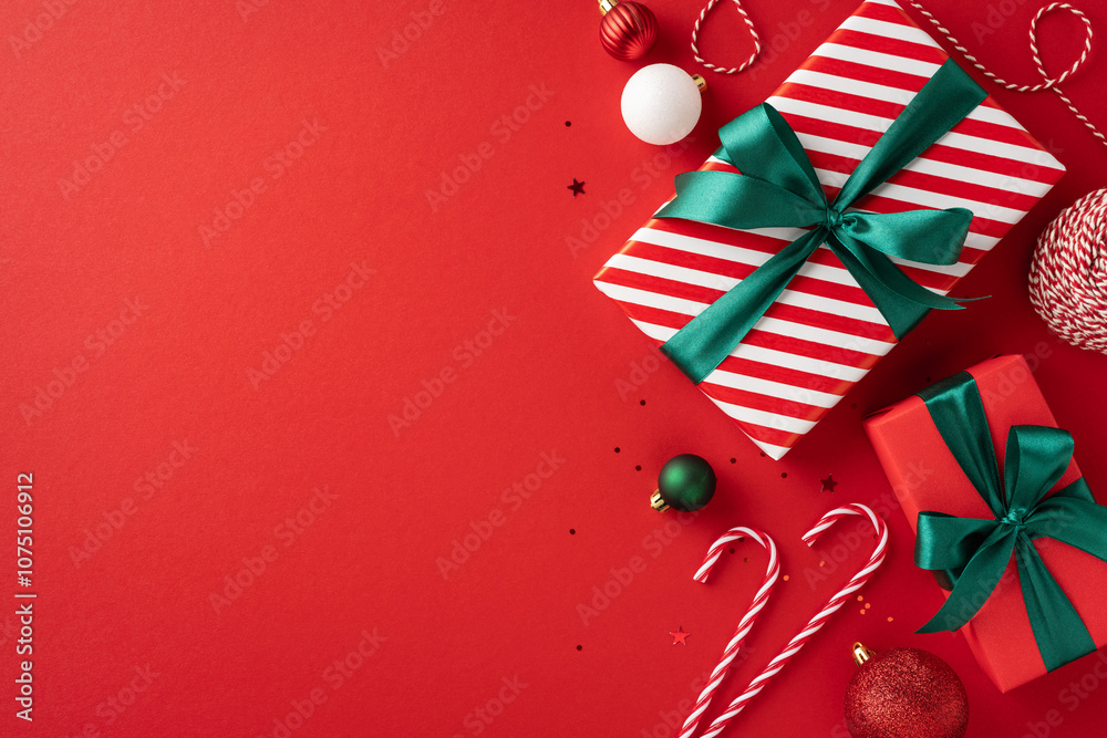 Red and white Christmas presents with green bows, candy canes, and festive ornaments on a red background create a joyful holiday scene