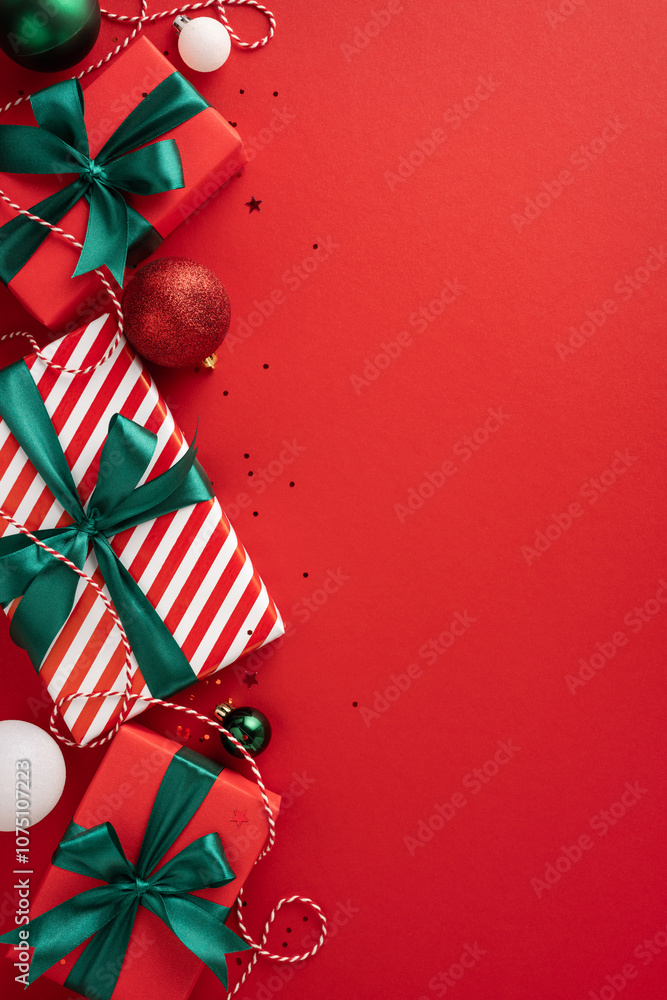 Christmas vertical presents wrapped in red with green ribbons and decorations on a vibrant red background, creating a festive holiday ambiance