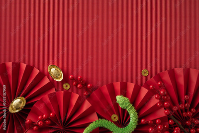 Festive Chinese New Year setup featuring vibrant red fans, golden coins, and decorative elements symbolizing good fortune and prosperity