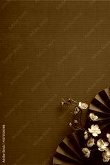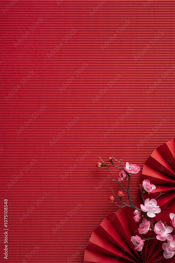 Delicate cherry vertical blossoms nestled with a traditional red fan against a rich, textured backdrop, symbolizing elegance and celebration