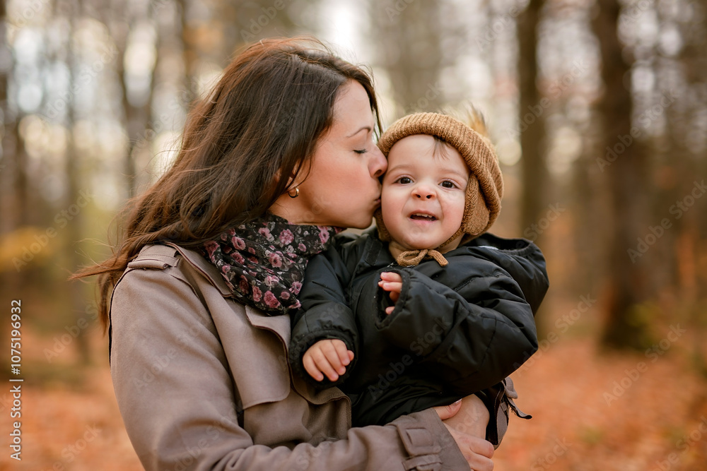 Joyful mother and his little baby. mother and child have fun, laugh and enjoy nature outdoors at autumn park.