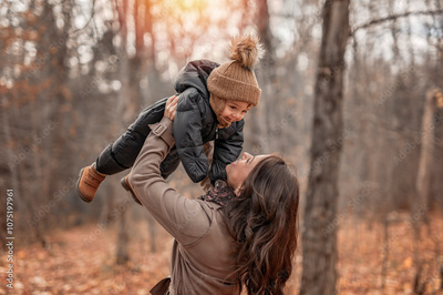 Joyful mother and his little baby. mother and child have fun, laugh and enjoy nature outdoors at autumn park.