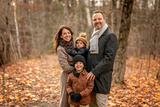 Joyful family and childs having fun, laugh and enjoy nature outdoors at autumn park.