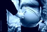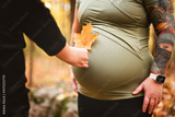 Lesbian couple having fun on autumn forest with future newborn child on woman belly.