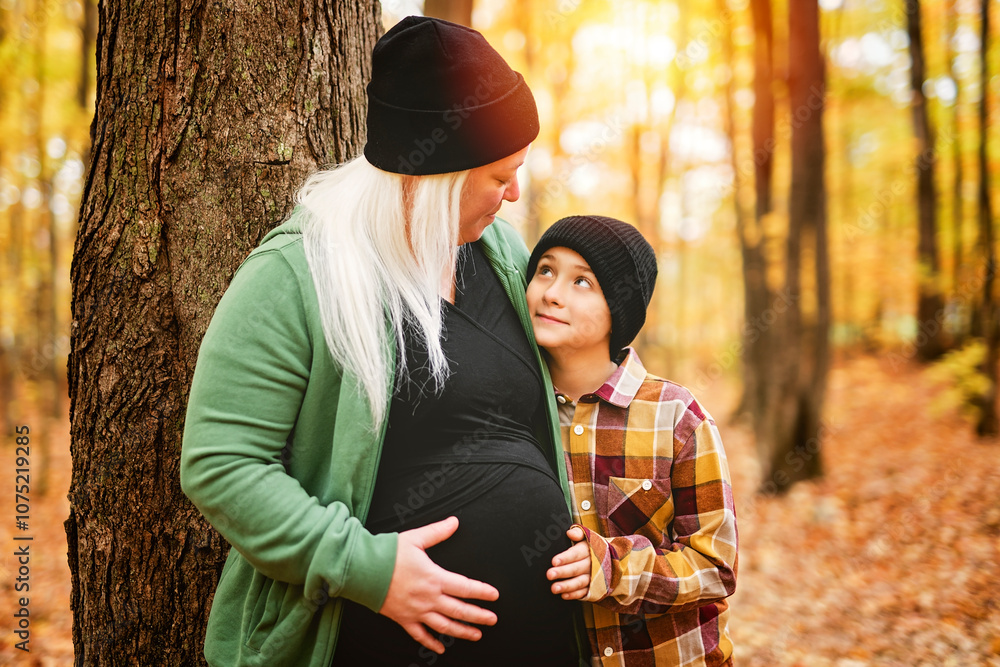Joyful pregnant mother and his little boy. mother and child have fun on nature outdoors at autumn park.