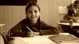 Caucasian clever happy little girl school test study task exam writing notes class lesson learn write copybook kid schoolgirl child pupil studying learning primary education smiling at camera at desk