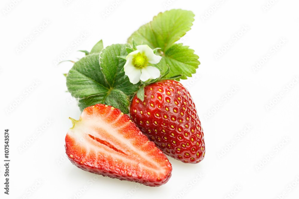 Strawberry with leaves and flower, with one cut in half , on white background.