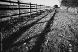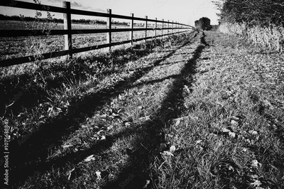 Abstract view of a long wooden paddock fence casting dark shadows on the grass underneath.