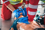 Hands of paramedic and doctor during resuscitation. Team of emergency medical service during CPR training on dummy. Themes rescue, urgency and health care.
