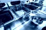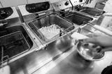 commercial kitchen scene with a deep fryer cooking French fries. hand holds a metal bowl, highlighting the food preparation process. Ideal for culinary, food industry, and restaurant-related themes.