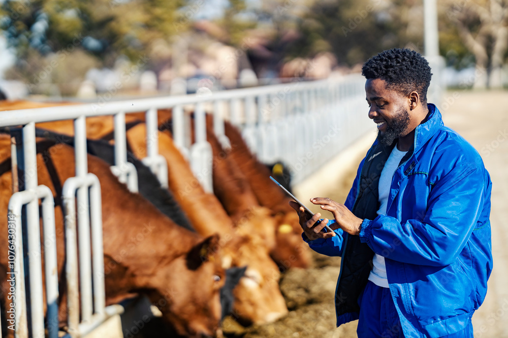 Happy black farmer scrolling on tablet at cow's ranch and using technologies for modern cows breeding.