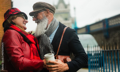 Happy senior couple having fun walking outdoors during winter vacation - Focus on man face - Travel and elderly joyful lifestyle concept
