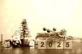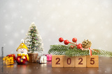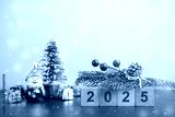 Wooden blocks 2025, Christmas tree and gifts. Merry Christmas and Happy New Year! Xmas concept. Festive winter holiday. Snowfall