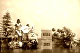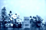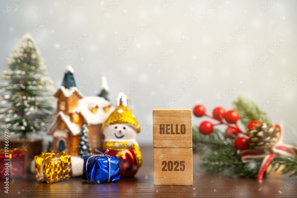 Wooden blocks Hello 2025, Christmas tree and gifts. Merry Christmas and Happy New Year! Xmas concept. Festive winter holiday. Snowfall