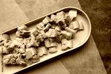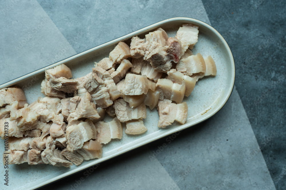 Slices of boiled pork belly bite sized pieces in long tray. Top view