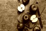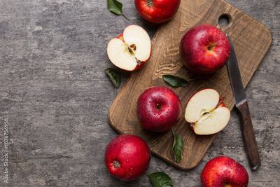 Fresh red apples with green leaves on table. cutting board with knife. Top view