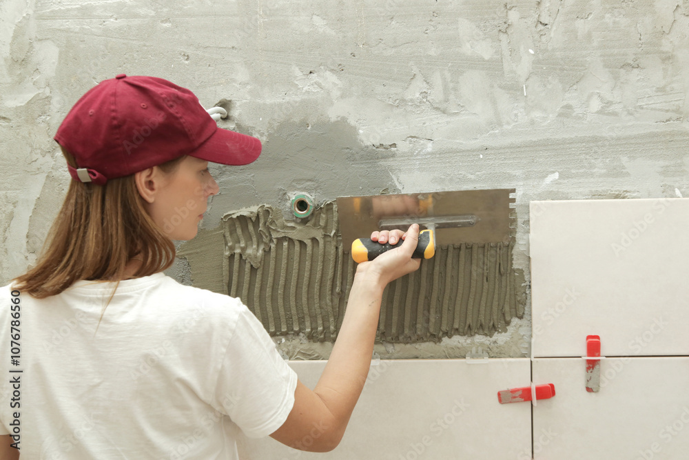 Woman tiling bathroom walls, applying adhesive on a tile and placing ceramic tile in right position. Process of installation of tiles in the bathroom step by step. DIY home improvement.