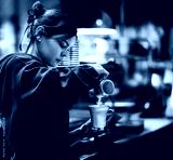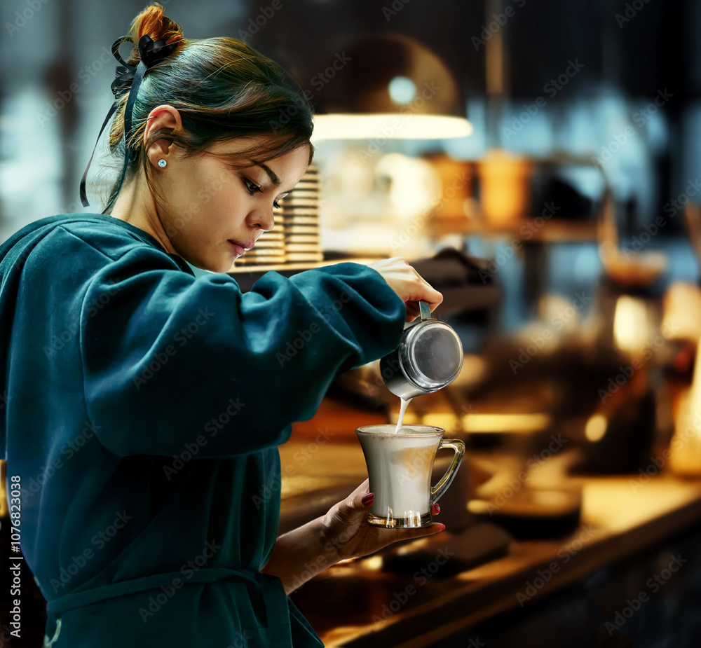 Female Barista Elegantly Pouring Beautiful Latte Art in a Warm and Cozy Cafe shop