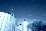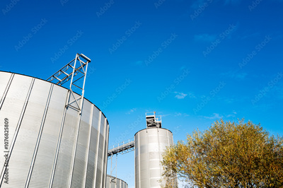 Bright metal grain silos seen against the autumn sun at a grain store and drying facility in the UK. The grain, winch dried is loaded and distributed to the food industry.