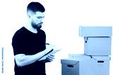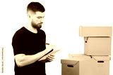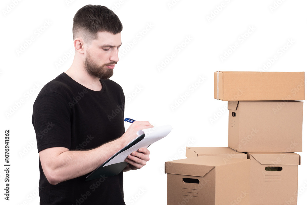 A man taking inventory with a clipboard beside stacked cardboard boxes, highlighting logistics, warehouse management, and organization in a storage setting.