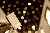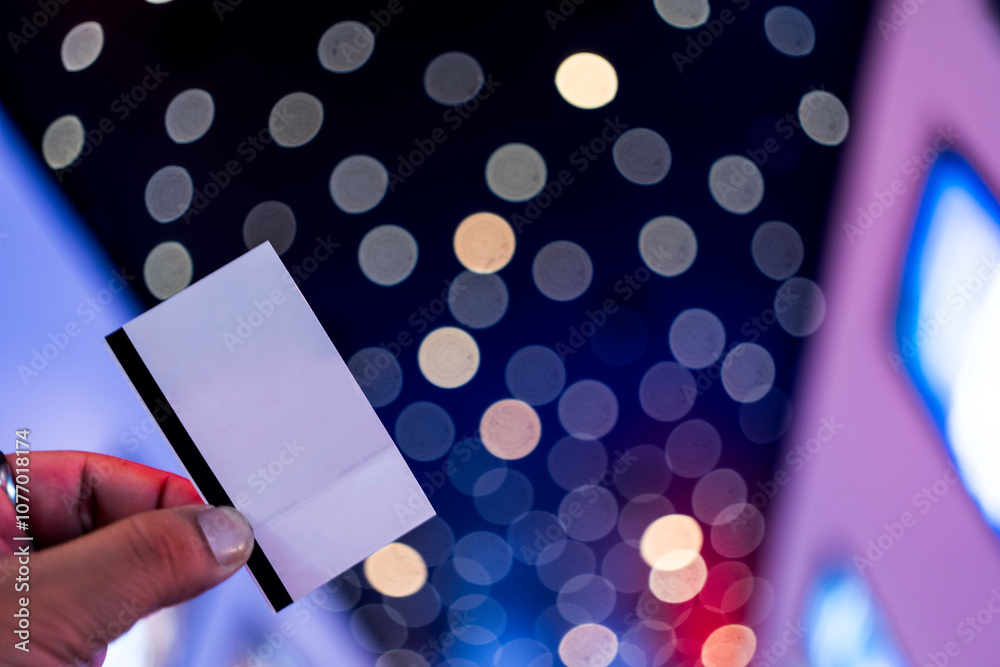 Man holding or showing a cinema ticket with lighting bokeh background. Booking ticket concept