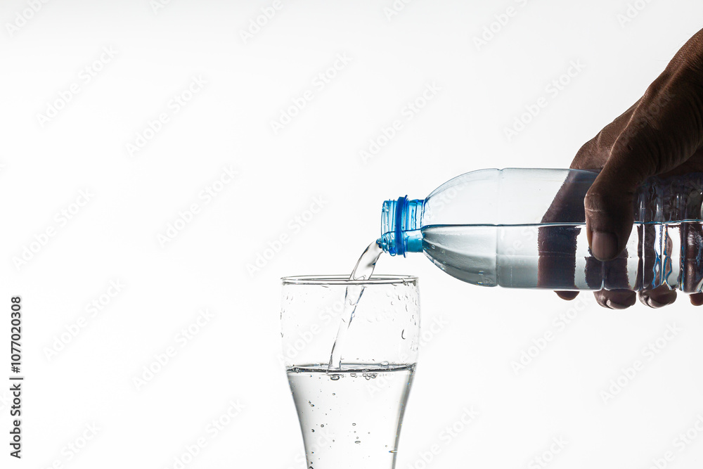 Human hand pouring water into glass isolated on white background,Hand pouring water from jug with ice into glass isolated on white background