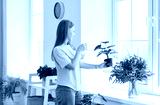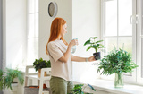 Young woman standing near window, spraying water on potted green house plant flower. Redhead girl taking care of houseplant, watering it with spray bottle, enjoying gardening in bright room at home.