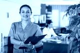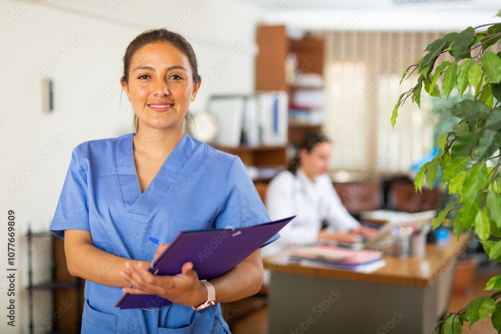 Positive Latino doctor woman standing in office with clipboard, writing medical history sheet