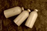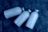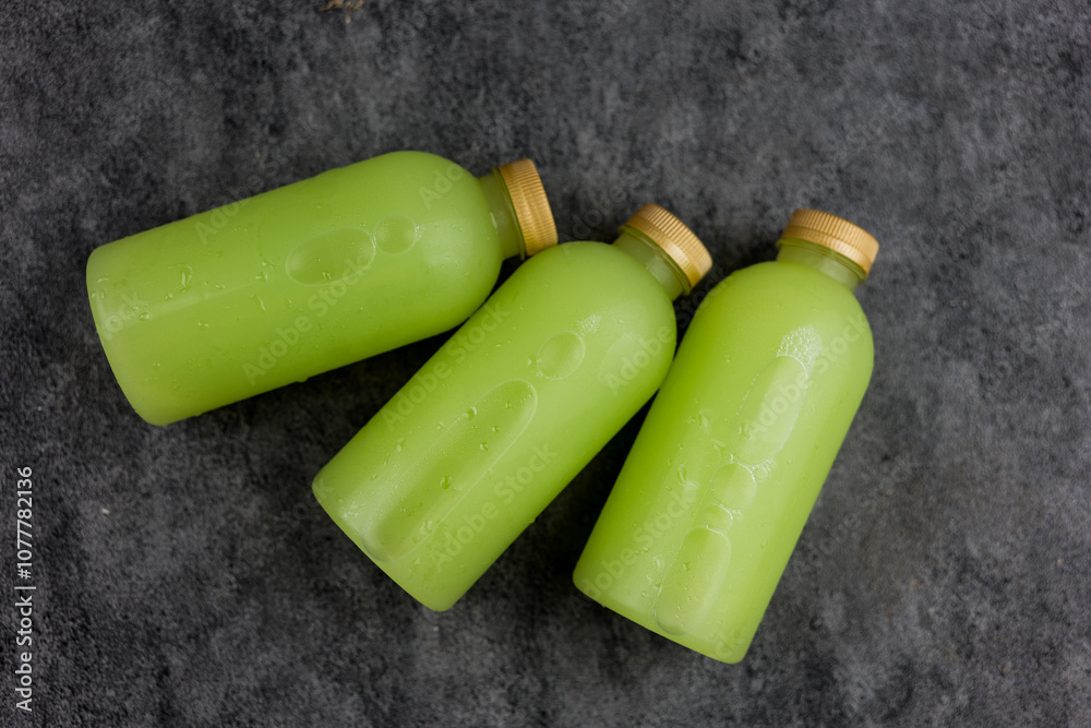 Bottles of cold pressed guava juice with golden lid three bottles. Top view
