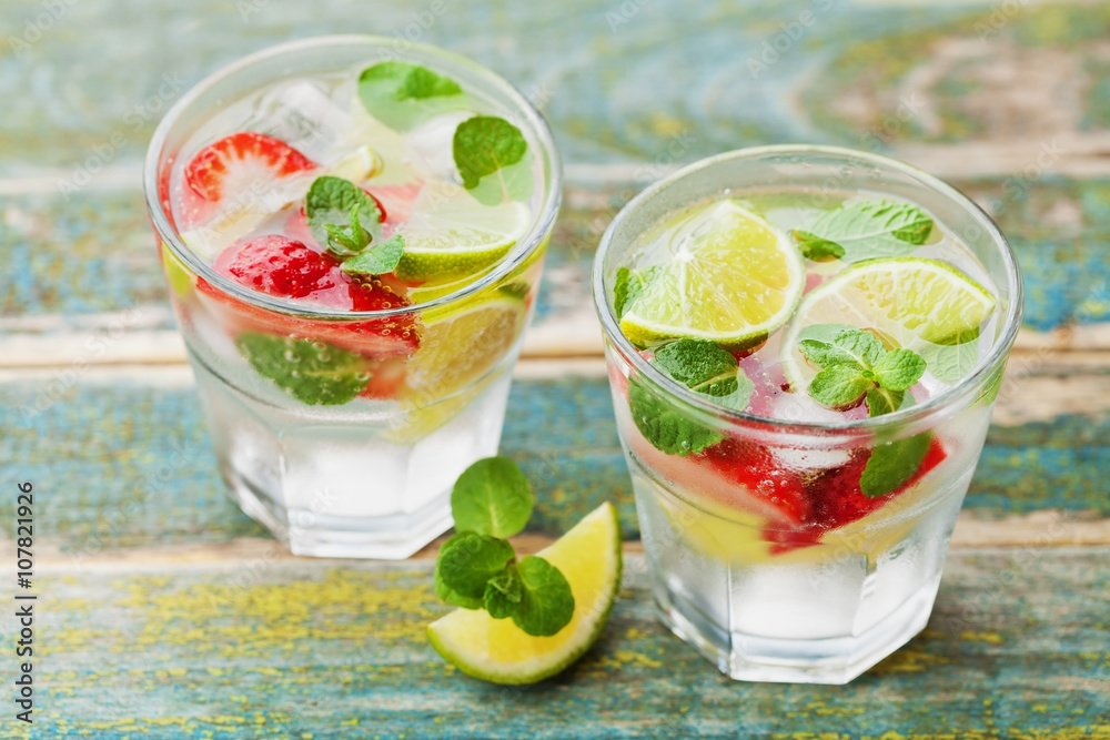 Summer lemonade or cocktail with lime, ice, strawberry and green mint in glass on rustic wooden table, mojito