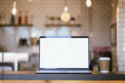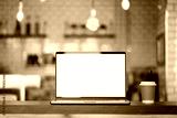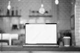 Blank laptop screen on wooden table with coffee shop interior background and blurred bokeh lights. Mockup model. Template for your text.