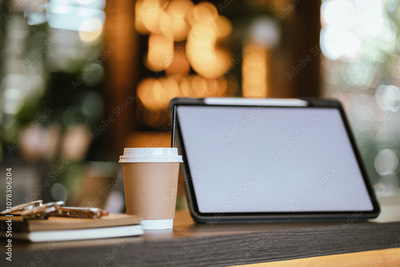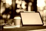 Blank laptop screen on wooden table with coffee shop interior background and blurred bokeh lights. Mockup model. Template for your text.