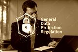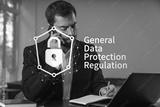 Businessman on phone with GDPR lock symbol and text on transparent overlay.