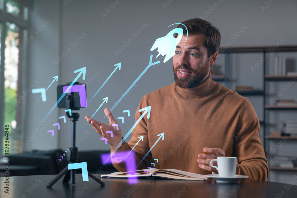 Man in a casual sweater recording video with digital graphics of arrows and a rocket icon.