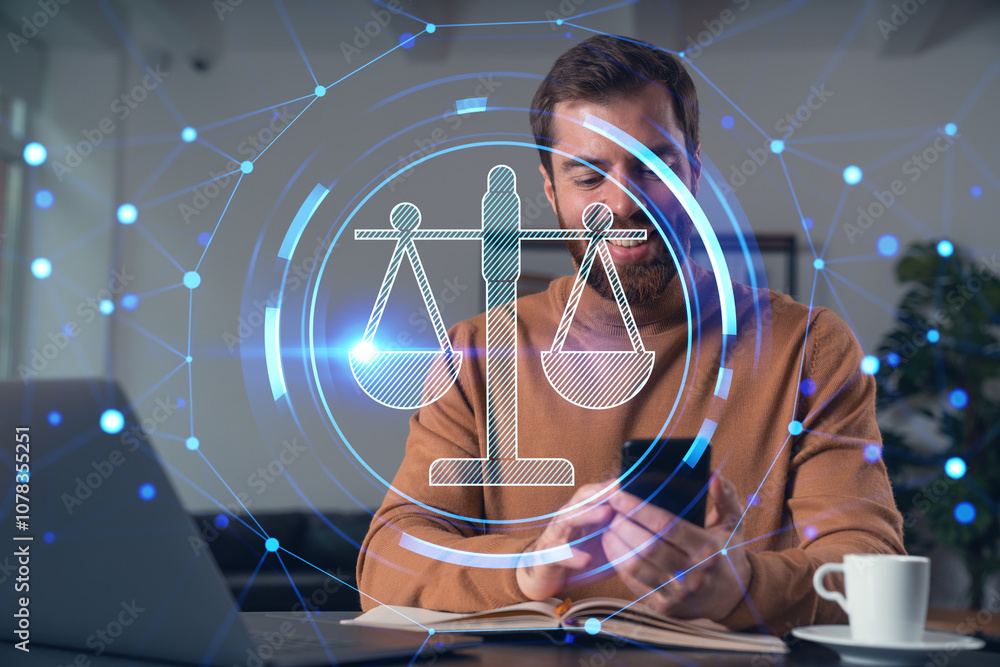 Man using smartphone with digital justice scales icon overlayed on screen in office setting.