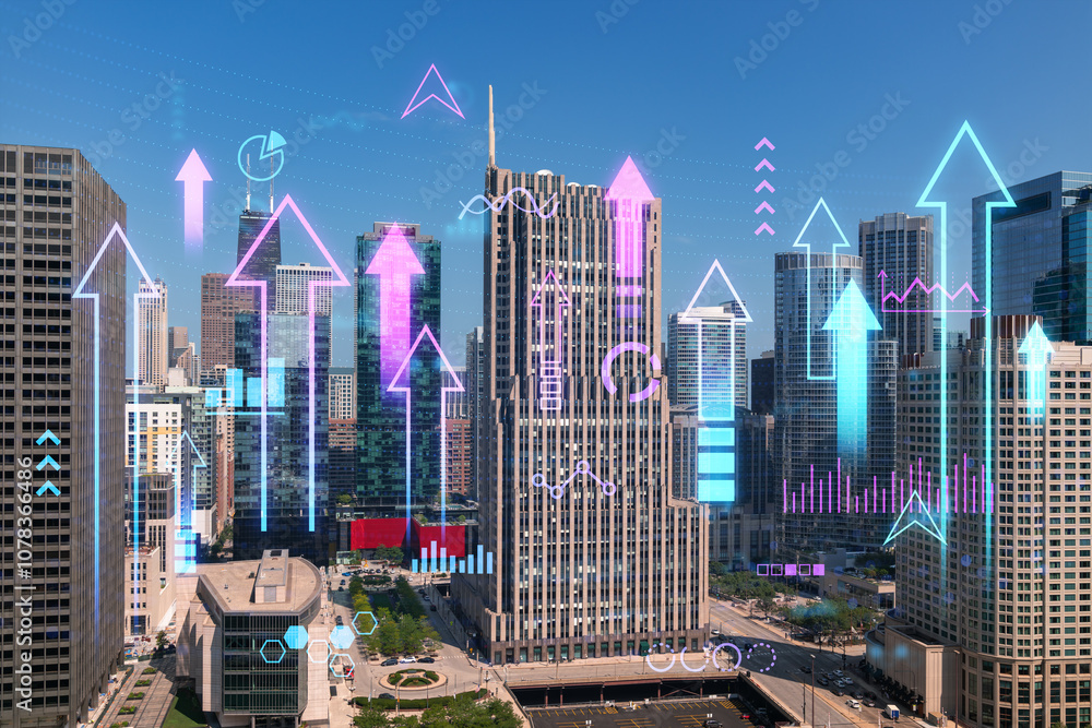 Chicago skyline with digital data overlays and growth arrows on a sunny day.