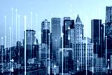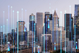 Seattle city skyline with digital data and upward arrows concept on a clear evening.