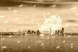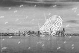 Digital fingerprint over Seattle skyline with binary code overlay on a bright day.