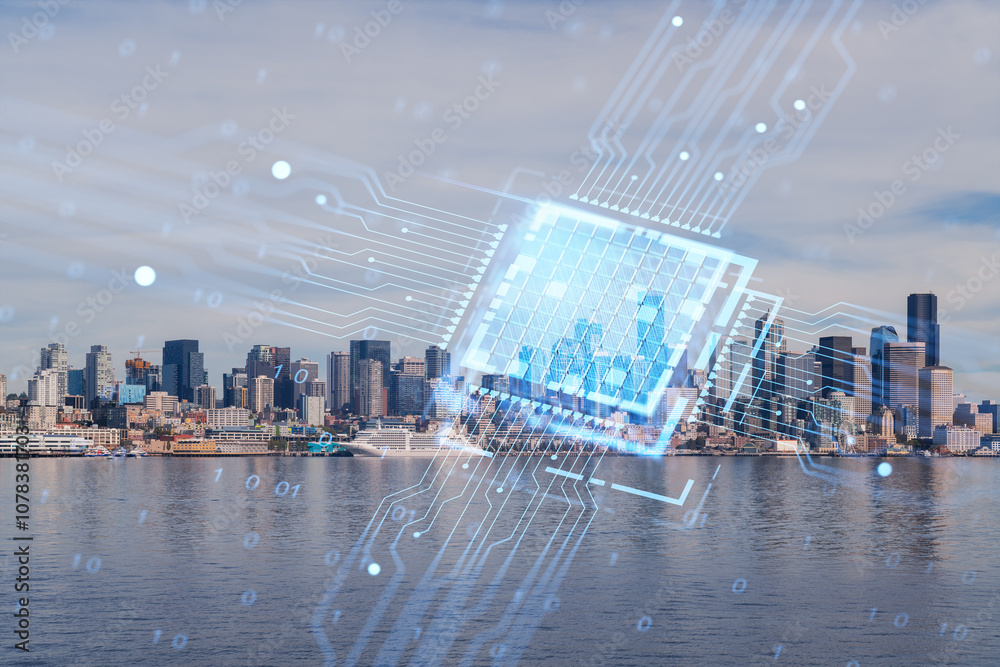 Seattle cityscape with digital circuit overlay and water reflection in foreground.