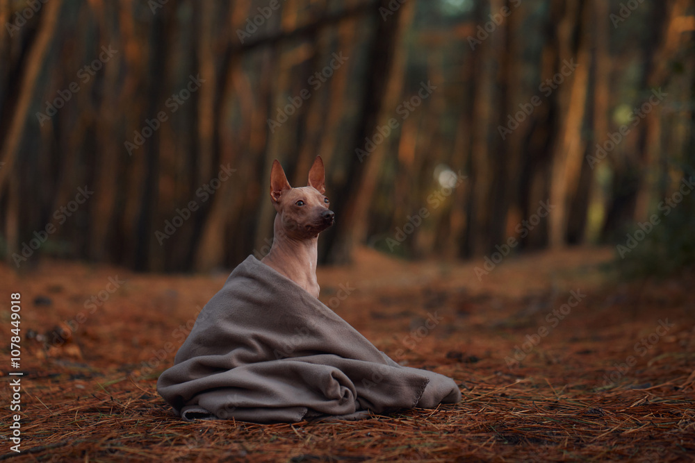 An American Hairless Terrier sits wrapped in a blanket in the forest, surrounded by tall trees. The dog looks cozy and peaceful, enjoying the autumn scenery.