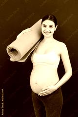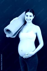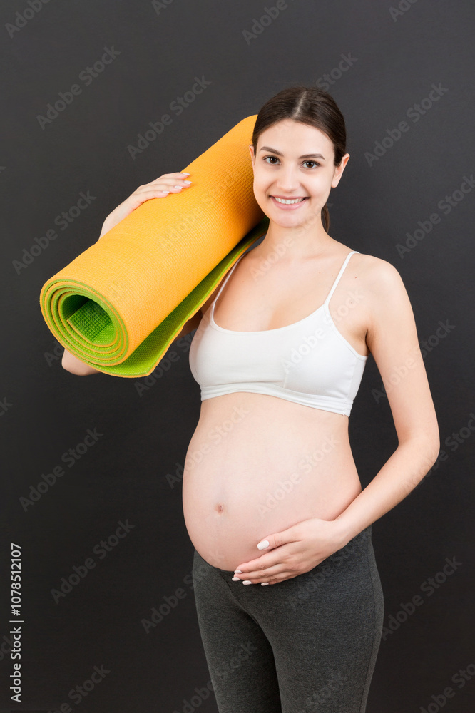 Pregnant Girl Holding Yoga Mat Standing Over Colored Background. Studio Shot, Free Space For Design