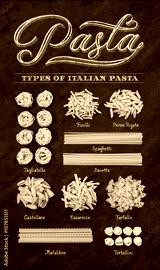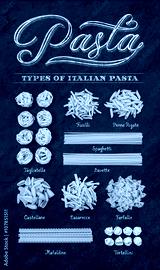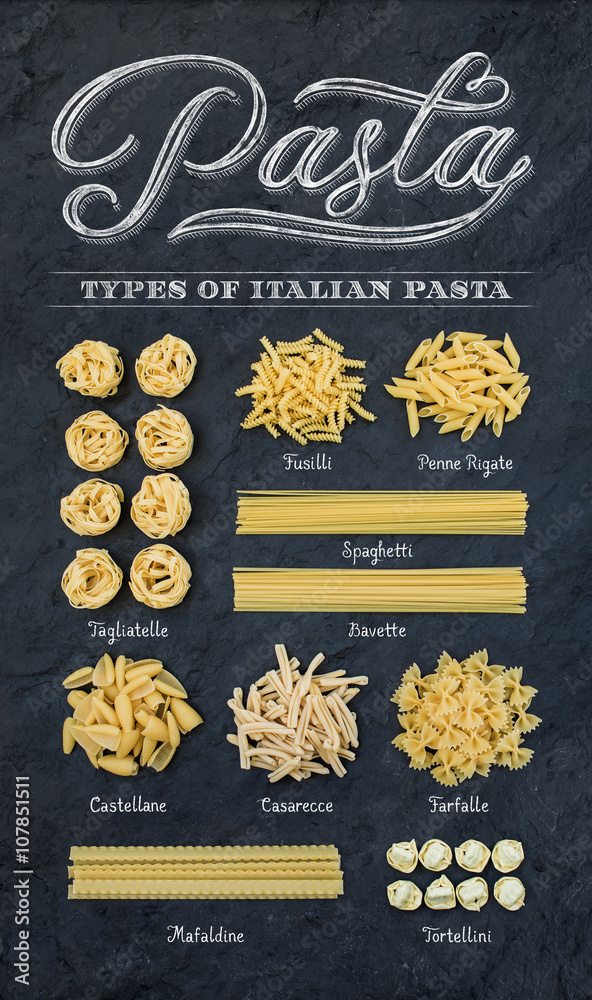Different types of Italian uncooked pasta on black slate stone background with white chalk lettering, top view.