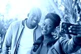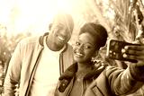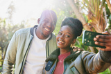 Happy Couple Taking a Selfie Outdoors on a Sunny Day in a City Environment