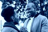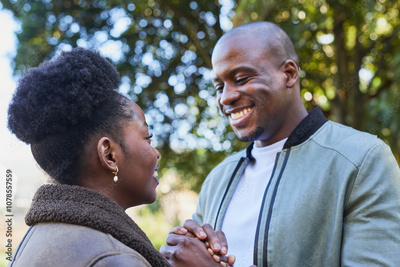Smiling Couple Holding Hands and Sharing a Joyful Moment Outdoors in a Sunlit Garden