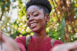 Joyful Woman Smiling in the Park on a Sunny Day - Capturing Natural Beauty and Happiness Outdoors in a Vibrant Setting